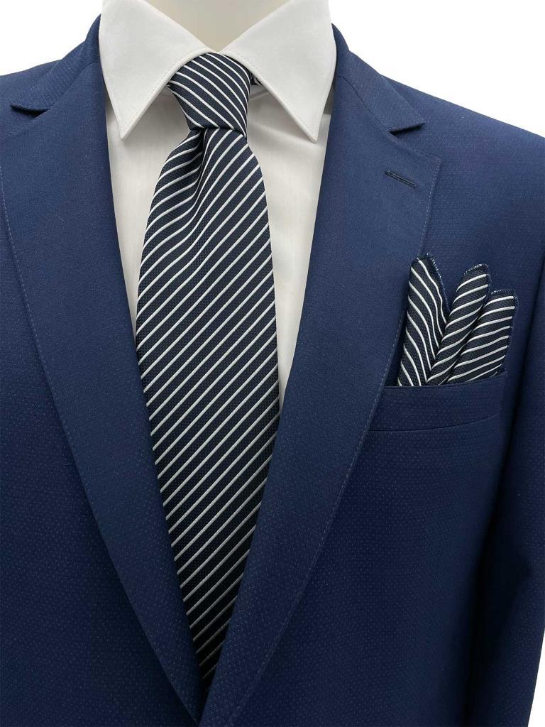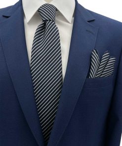 Yetişkin erkekler için özel olarak tasarlanmış, şıklığı ve rahatlığı bir arada sunan Lacivert Beyaz Çizgili desenli kravat mendil seti.