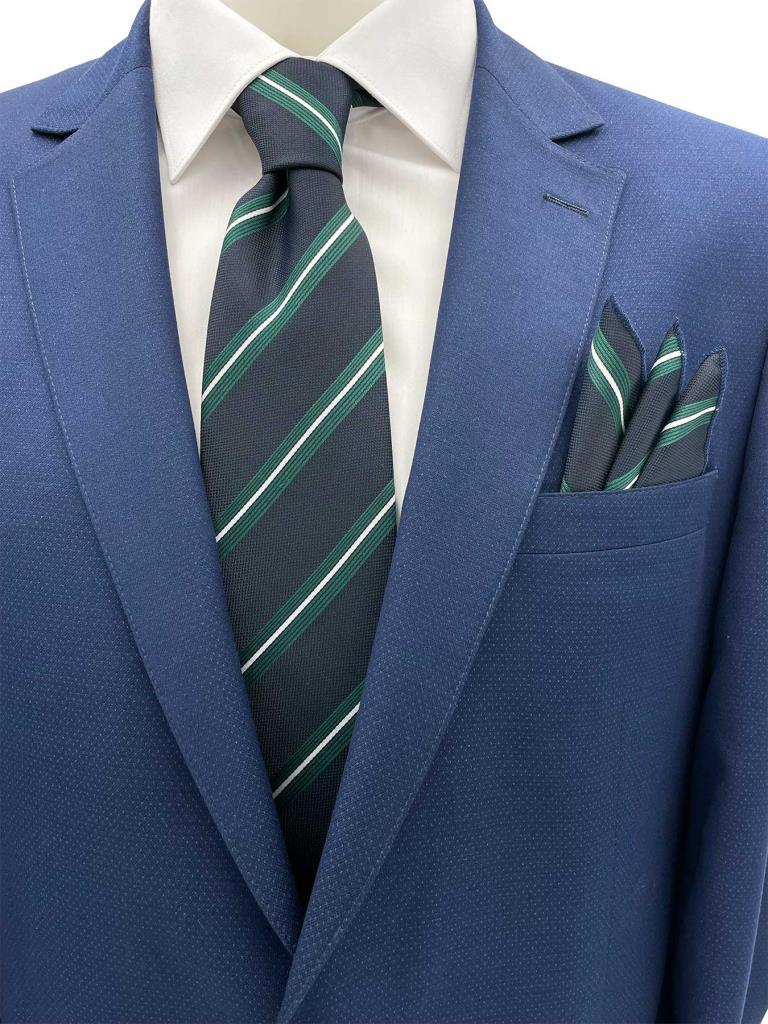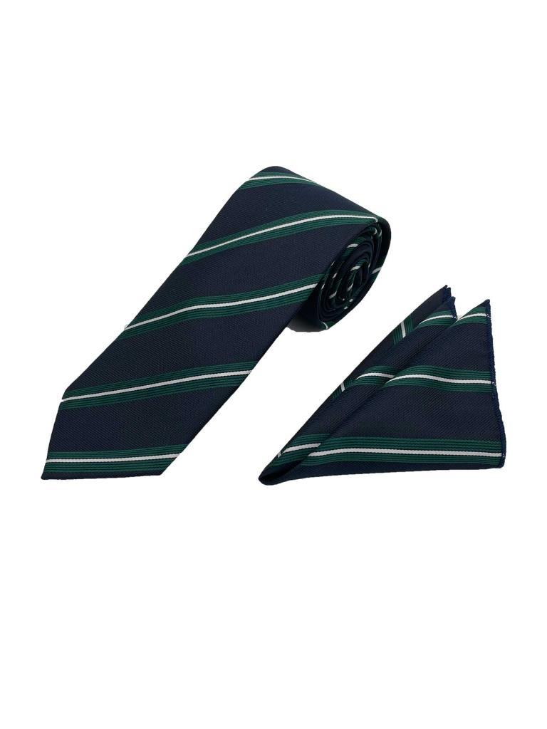 Brianze 7.5 Cm Lacivert Yeşil Beyaz Çizgili Kravat Mendil Set