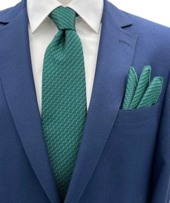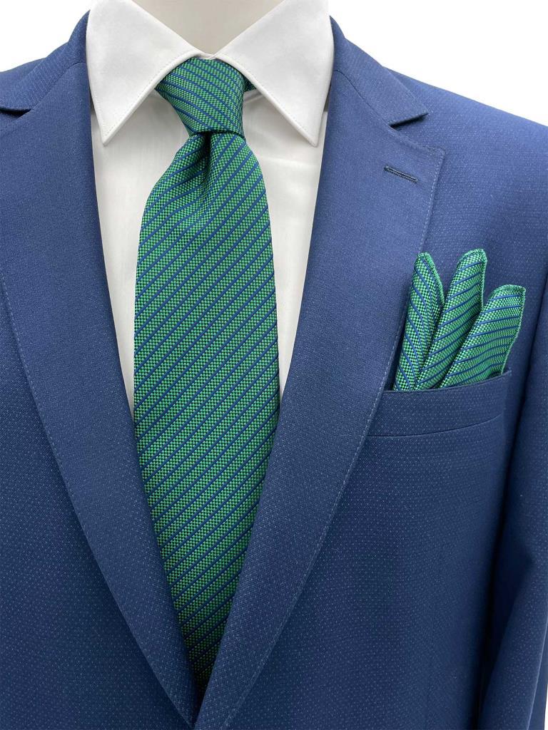 Yetişkin erkekler için özel olarak tasarlanmış, şıklığı ve rahatlığı bir arada sunan Yeşil Lacivert Çizgili desenli kravat mendil seti.