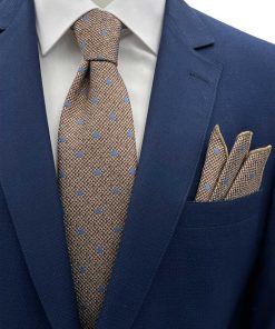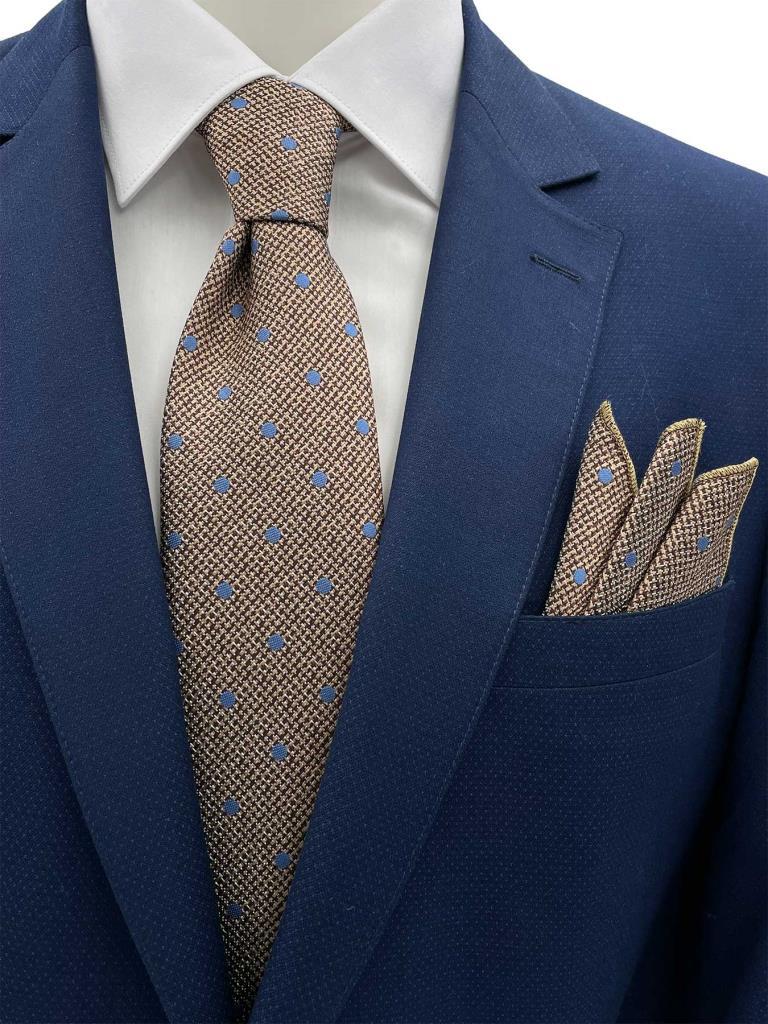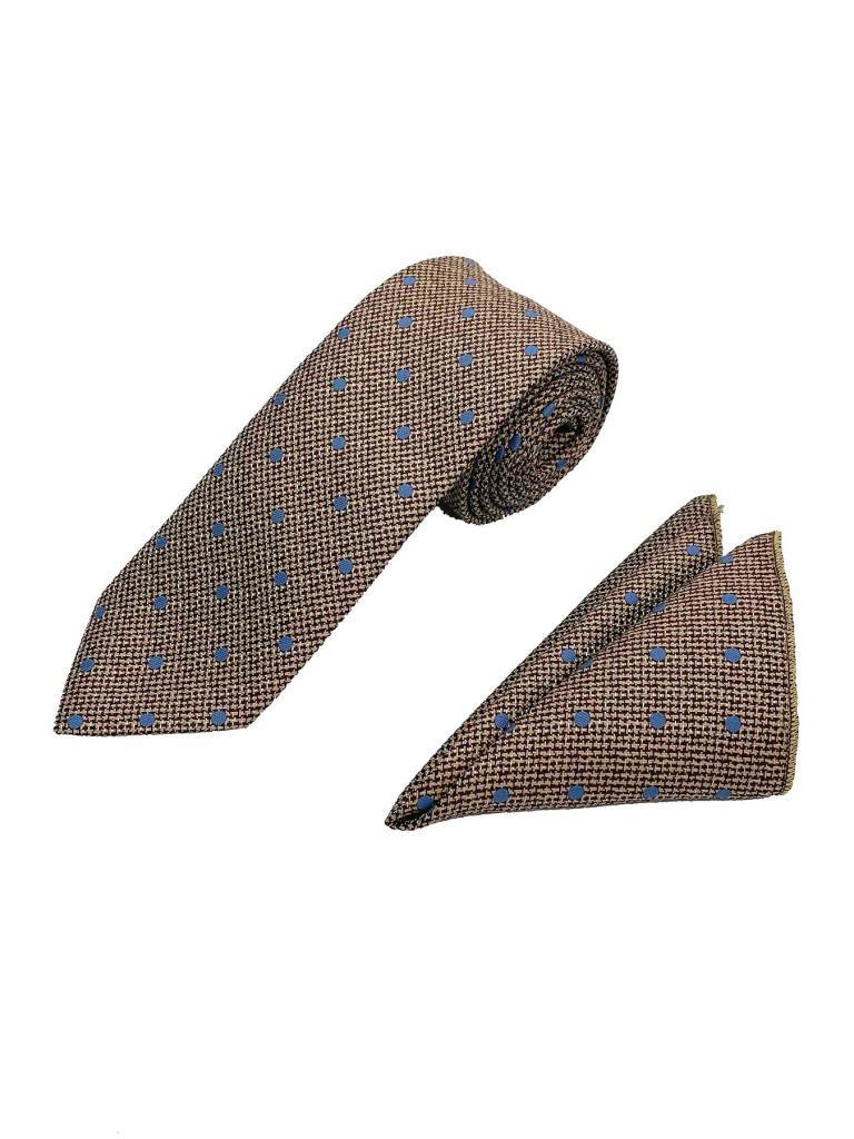 Brianze Bej Kahve Mavi Puantiye Desen Kravat Mendil Set