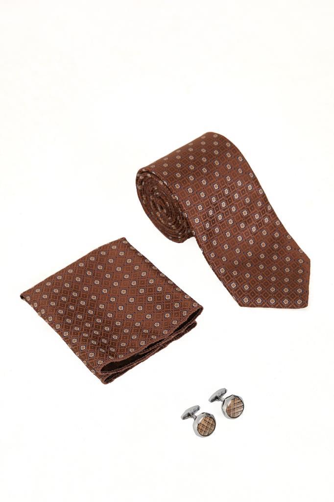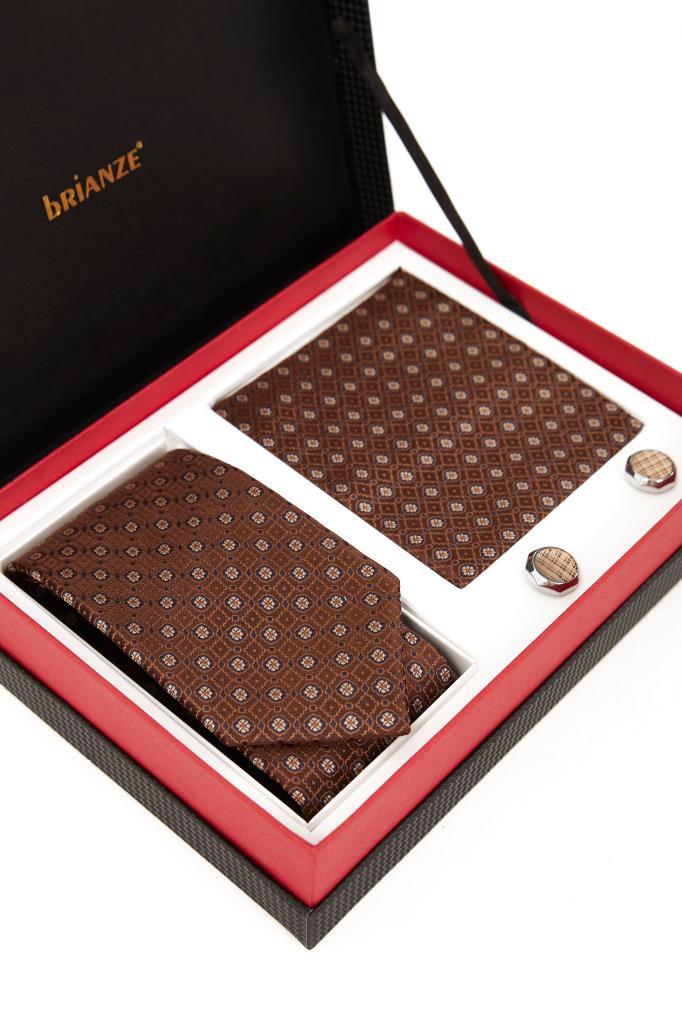Brianze Kahve Desenli Kravat Mendil ve Kol Düğmesi Hediyelik Set